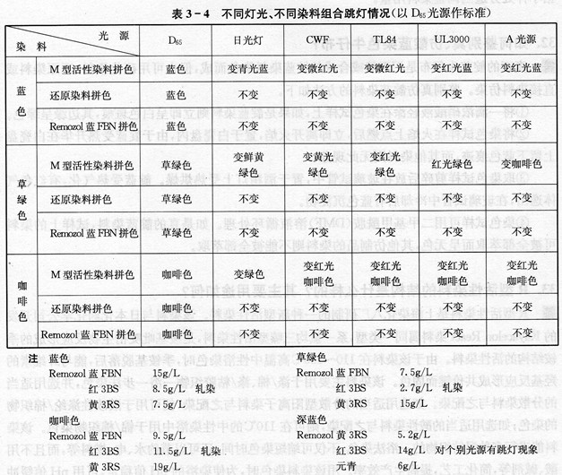 答 染色物在不同光源下,被人们用肉眼观察时,能产生不同的色泽。这种因光源不同所产生的颜色差异称光演色性或光演性。若染色布的颜色不受光源的影响或影响很少,称为光演色性好。反之,称为光演色性差。绝大部分的染料都有光演色性,同一种染料有的光演色性好,有的光演色性差。还原染料一般光演色性都较好,但还原染料的蓝色(如RSN蓝等),在荧光灯下可呈带红光的紫蓝色。活性染料中德司达公司生产的Remozol(雷玛唑)活性染料,对光演色性较好。如Re-mozol黄3RS、Remozol红3BS、Remozol蓝FBN三原色,稳定性好,在不同光源下跳灯现象较少,特别是用蓝FBN拼色的色泽。现将该染料拼色后(轧染)的蓝色、草绿色、咖啡色,在不同光源下变色性情况与KN型活性染料、M型活性染料、还原染料对比参考,如表3-4所示。