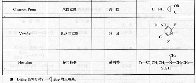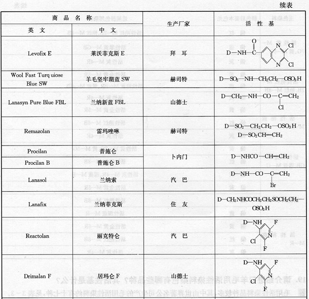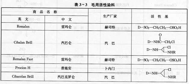 答 毛用活性染料品种较多,其中由世界著名公司生产的毛用活性染料约有十七种,见表3—3。