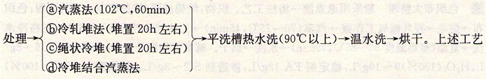③净棉酶用于筒子纱练漂。设备:筒子染色机,浴比1:10,528个筒子原纱(每只852g,共重450kg),水量4500L,除氧酶(百胜PC一133),醋酸。净棉酶用量3g/L,H202(浓度27%)7g/L,升温1℃/min。工艺流程:原棉筒子纱装笼一净棉酶SX1处理(95℃,90min)→热水洗(80℃,20min)→醋酸洗(50℃,20min)→除氧(50℃,20min)→待染色。操作:30℃加净棉酶(热水化开),运转10min,升温至70~80℃,加H2O2,运转5min,以1℃/min升温至95℃,保温处理90min,排液,热水洗、醋酸洗、除氧处理。
