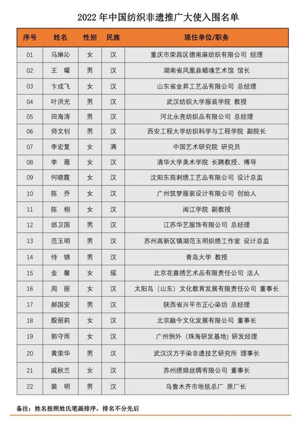 经过近两个月的全面征集推选和严格初评,来自12个省、市、自治区的22位入围名单已确定。按照推选程序,现通过中国纺织工业联合会官方媒体及《中国纺织非遗》微信公众号面向社会公示入围姓名、职务(称)及个人主要业绩、工作成果,公示期间无任何不良反馈将进入候选人资格。公示时间为2022年8月30日至9月2日,终入选结果将在第六届中国纺织非物质文化遗产大会上揭晓。
