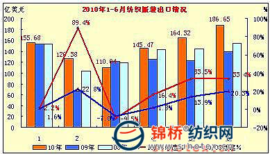 6月纺织服装出口创新高。6月纺织服装出口186.6亿美元,创历史单月新高,同比增长33.4%,比2008年6月增长20.3%。其中纺织纱线、织物及制品出口70.9亿美元,增长44.4%;服装出口115.72亿美元,增长28.1%,为近2年来单月高增速。上半年纺织服装出口888.8亿美元,同比增长22%。