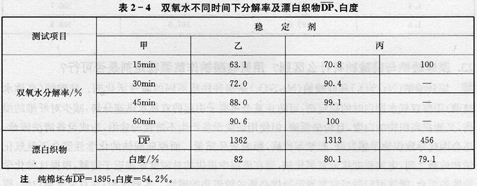 答 在双氧水漂白工艺中有常规漂,煮漂合一,退、煮、漂一步法及冷轧堆等不同工艺。在这些工艺中,双氧水漂白都是在碱性溶液中进行的。双氧水在碱性条件下及金属离子存在下,极易分解。双氧水的过早催化分解不仅造成漂液失效并能促进纤维损伤。为此在双氧水漂白时,必须加入稳定剂,使双氧水分解速度减慢,有效地进行漂白,同时可不损伤纤维或减少纤维损伤。目前,双氧水稳定剂大致可分为无机稳定剂和有机稳定剂。无机稳定剂中常用的是硅酸钠;有机稳定剂包括螯合型稳定剂、羟基羧酸类、磷酸盐类、高分子化合物及表面活性剂类等。这些稳定剂中由于原料、成本等因素的不同,其使用效果不一。一般工厂检验双氧水时,不需要做定性与定量分析,定量分析可测定其含固量。工厂中一般可检验其应用效果,即对稳定剂的评价试验。试验时,可根据工艺要求,在配制漂液时先加入碱剂和稳定剂,再加双氧水,然后测定若干时间后双氧水浓度的变化,求得不同时间内双氧水的分解率。也可采用半衰期作评价依据,即双氧水分解率达50%时的时间。除此以外还要根据漂白后的白度、纤维损伤程度(用聚合度DP的大小)等因素,综合评价该稳定剂的效果。测定双氧水的浓度时可在锥形瓶中加入20mL 蒸馏水、10mL漂液、20mL 20%硫酸溶液,充分混合。用0.588mol/L高锰酸钾标准溶液滴定,滴至出现粉红色,并在30s内不褪色为止,记录耗用高锰酸钾溶液的体积V。V×0.01即为双氧水的每升克数,并由此计算出不同时问下双氧水的分解率。现举例说明如下:某工厂浸漂工艺配方为100%双氧水6g/L,渗透剂1g/L,100%NaOH 10g/L,精练剂5g/L,稳定剂4g/L(采用甲、乙、丙三种稳定剂对比、用量相同);浴比1:15;温度100℃,时问60min,试验结果见表2-4。