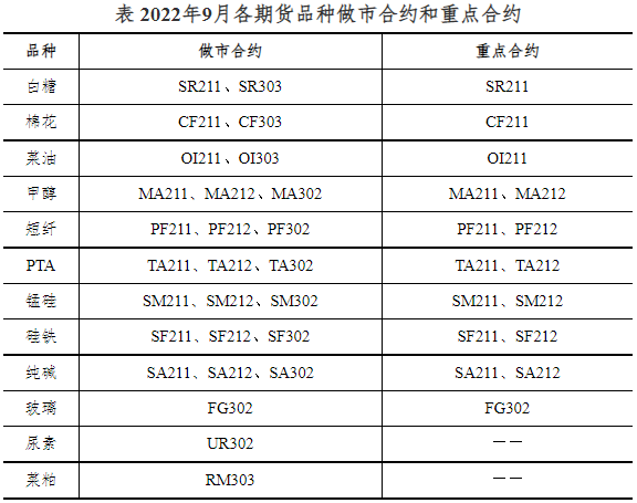 郑商所关于2022年9月期货品种做市合约和重点合约的公告