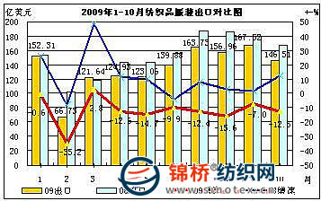 据中国海关统计,2009年10月我国纺织品服装出口额146.51亿美元,环比下降12.54%,同比下降12.51%。其中纺织品(包括纺织纱线、织物及制品)出口额52.94亿美元,同比下降4.79%;服装(包括服装及衣着附件)出口额93.57亿美元,同比下降16.34%。