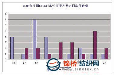 美国方面,据中国纺织工业协会统计中心统计,2009年前3季度,美国消费品安全委员会(CPSC)共发出约307件召回案件,其中对华发出召回案件163件,占整个召回案件数的53.09%,超过一半。对中国纺织服装类产品共发出21起召回,同比增加10.53%。