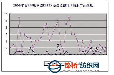 欧盟方面,据中国纺织工业协会统计中心统计,2009年1~9月,欧盟委员会非食品类快速预警系统(RAPEX)共发出通报1237起,同比增加21.16%,其中对华通报734起,同比增加30.37%。纺织服装类产品受到通报警告的数量激增,前3季度共收到通报153起,同比增加6.29倍,占全部对华通报比例的20.84%,而去年同期纺织服装类产品只占对华通报案件的3.73%,与金融危机爆发前相比增长趋势十分可观。