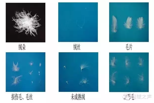 绒朵(绒子),绒丝,毛片(颈毛),毛丝,损伤毛,未成熟绒,陆禽毛,杂质等。