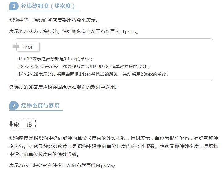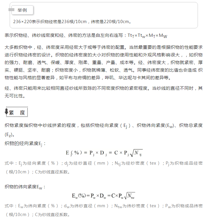 织物的经纬密是表示织物紧密程度的绝对值,与经、纬纱线的粗细无关,只能比较具有相同经纬纱细度的不同织物的紧密程度。而紧度是表示织物紧密程度的相对值,与织物所用经纬纱的粗细有关,无论织物所采用的经、纬纱细度如何,均可对织物的紧度程度、厚薄进行比较。