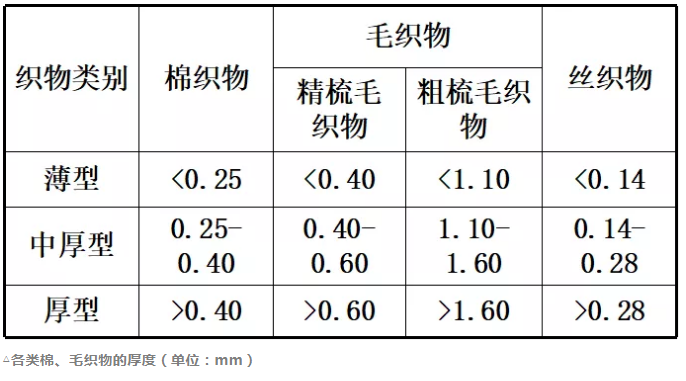 织物在一定压力下正反两面间的垂直距离,以毫米(mm)为计量单位。织物按厚度的不同可分为薄型、中厚型和厚型三类。