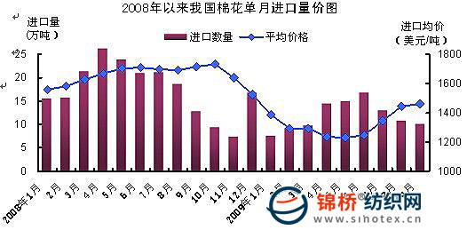 据海关统计,2009年前3季度我国进口棉花107.8万吨,价值14.2亿美元,分别比2008年同期(下同)下降39.1%和51.9%,进口均价每吨1314美元,下降21%。