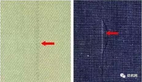 擦伤性疵点的产生是在织造过程中,布面或单根纱线与织机受损部位相摩擦,造成纱线损伤,下文将此疵点简述为磨痕。磨痕从外观看灯下布面的光泽度不同,连续的一条或多条发亮,仔细看布面略呈凹陷,像车轮压过一样,严重的纱线纤维束已经被破坏,强力损伤严重。经过后整理退浆、煮练、漂白、丝光处理后,布面显现明显条痕疵点。此类疵点都是连续的,成衣避裁难度大,于是预防和控制擦伤性疵点的产生是织造过程中质量控制的重中之重。