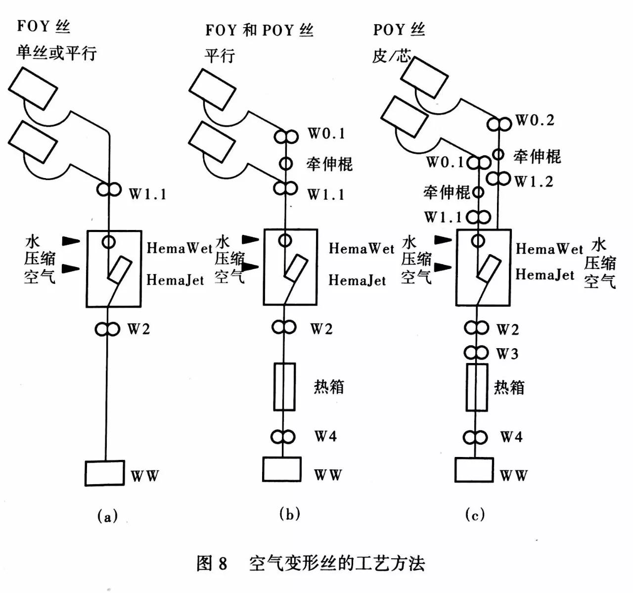 而空气变形技术是当丝线超喂地进入喷嘴的进丝口,由于超喂量的存在,湍急的气流将超喂的丝线的单纤维吹成圈状,企过高温热定形,卷曲状态的丝线即成为具有蓬松毛圈状的空气变形丝,它和假捻弹力丝一样,丝线呈蓬松状,而卷曲更明显,丝身无扭矩空气变形丝和网络丝一样,利用空气使单纤维变形,但丝身无网络点。