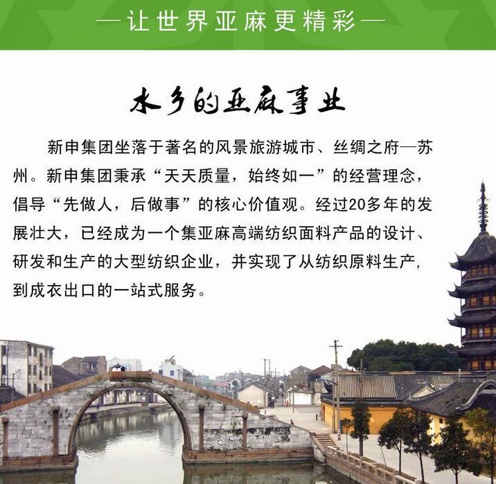 亚麻面料梦想家、全国亚麻面料十强企业的新申集团在国内外亚麻市场上都表现不凡。在市场需求风云变幻的今天,新申集团既立足于传统生产型企业的先进生产工艺,但又不拘泥于传统的营销模式,在国际、国内市场上一路领先。新申亚麻文化创意园2014年开工建设,规划面积6000平方,依托新申集团完整亚麻产业链,建设亚麻文化中心、成果展示中心、创客基地、亚麻面料档案馆、企业文化馆等多功能亚麻产业创新创业平台。