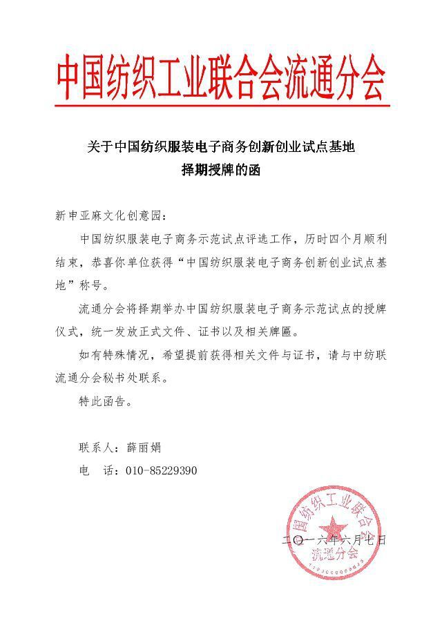6月3日,中国纺织服装电子商务示范试点基地名单正式对外发布。经评选公示,终评选出中国纺织服装电子商务公共服务示范基地13家,中国纺织服装电子商务创新创业试点基地16家,中国纺织服装电子商务创新创业试点平台8家,2011-2015年度中国纺织服装电子商务推动奖16人。其中,新申亚麻文化创意园荣获“中国纺织服装电子商务创新创业试点基地”称号。