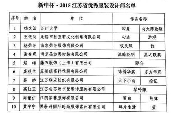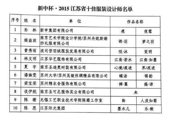 近日,江苏省服装协会、江苏省服装设计师协会代表江苏国际服装节组织委员会办公室官方公布了《关于公布新申杯·2015江苏省十佳服装设计师评选结果的通知》。在通知中全面总结了新申杯·2015江苏省十佳服装设计师评比活动,并发布了“新申杯·2015江苏省十佳服装设计师名单”和“新申杯·2015江苏省优秀服装设计师名单”。