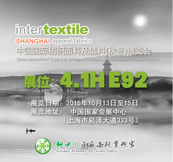 2015Intertextile将于下月13日在国家会展中心(上海)盛装绽放,千余家中外展商将进行“智造”大比拼,展现“创新驱动、智能转型、强化基础、绿色发展”的“工业4.0”宏伟蓝图。同期同地举办的还有中国国际服装服饰博览会(秋季)、中国国际针织博览会、中国国际纺织纱线(秋冬)展览会。以及在上海世贸商城举办的首届中国国际非织造材料展览会暨高端论坛,五展联动,盛况空前,将为业内人士奉上一场2015年中国产业链更全、规格更高、展览门类更广的纺织盛宴。