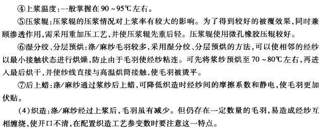 (3)纱线捻度:为了减少纱条毛羽,提高成纱光洁度,增加纤维间的抱合力,纱的捻度可适当提高,一般超过临界捻系数10%左右。同时也提高了织物的挺括度。