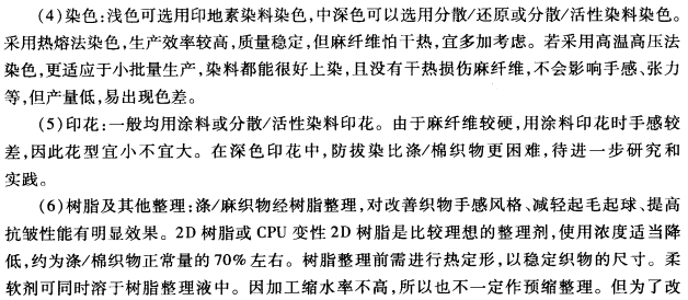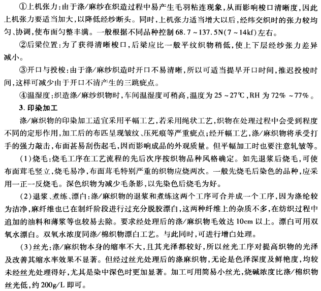 (1)混纺比:涤麻混纺细特单纱织物以内销为主,考虑到国内消费特点和消费水平,织物应该挺括,不易起皱,布面较细洁,所以涤纶的混纺比高于苎麻。一般,涤纶的混纺比为55%~70%,苎麻的混纺比为30%~45%。