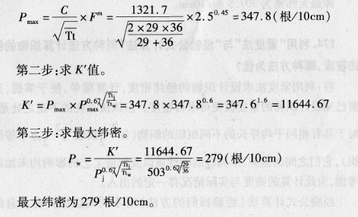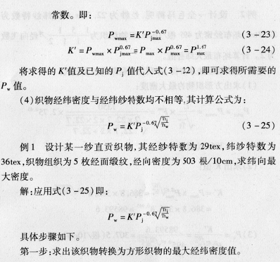 (1)方形织物的经、纬密度:织物经、纬密度相等,经、纬纱特数相同的织物,称方形织物。其大经、纬向密度值计算公式为: