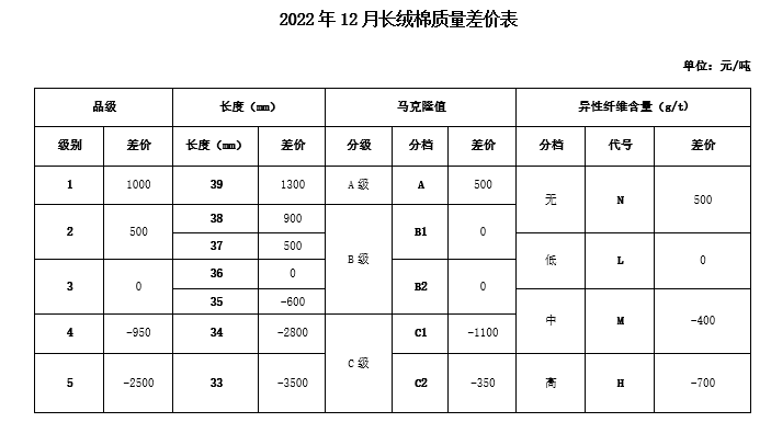 根据《中国棉花协会国产棉质量差价表管理办法》规定,现正式发布2022年12月《锯齿加工细绒棉质量差价表》、《皮辊加工细绒棉质量差价表》和《长绒棉质量差价表》(单位:元/吨)。
