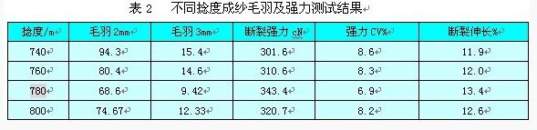 设定负压为3.0Kpa,采纳四种不同捻度纺纱,成纱毛羽与强力测试结果见表2
