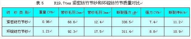 密切纺竹节纱产品质量明显优于传统环锭纺竹节纱,见表5