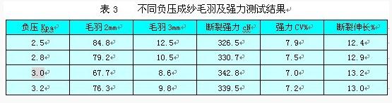a.对密切纺异形管负压大小进行重点测试,对照毛羽与强力,选择优负压。