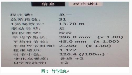 我们参照一般针织物纱的质量检测体系,对成批生产的针织物用竹节纱制定了成纱质量检测指标,包含平均号数、单纱强力、单强CV%、百米分量CV%、细纱捻度及捻度CV%等指标,同时由落纱组长对每落纱竹节装置是否正常起作用进行检查、记录,有异样及时报告,确保万无一失。