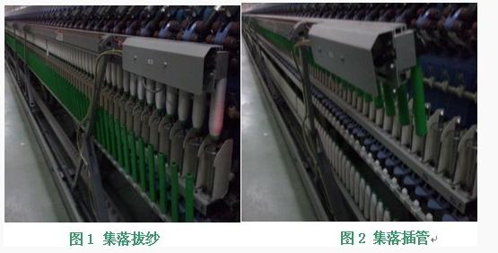 ②整体落纱装置:长车整体落纱是体现细纱自动化程度的主要部分。气架升降动作是通过伺服系统传动螺杆式积极升降,驱动落纱气架平稳升降,气架里摆、外摆动作采纳单汽缸操纵,动作定位精确。整台落纱时间3分钟,生产效率较高。