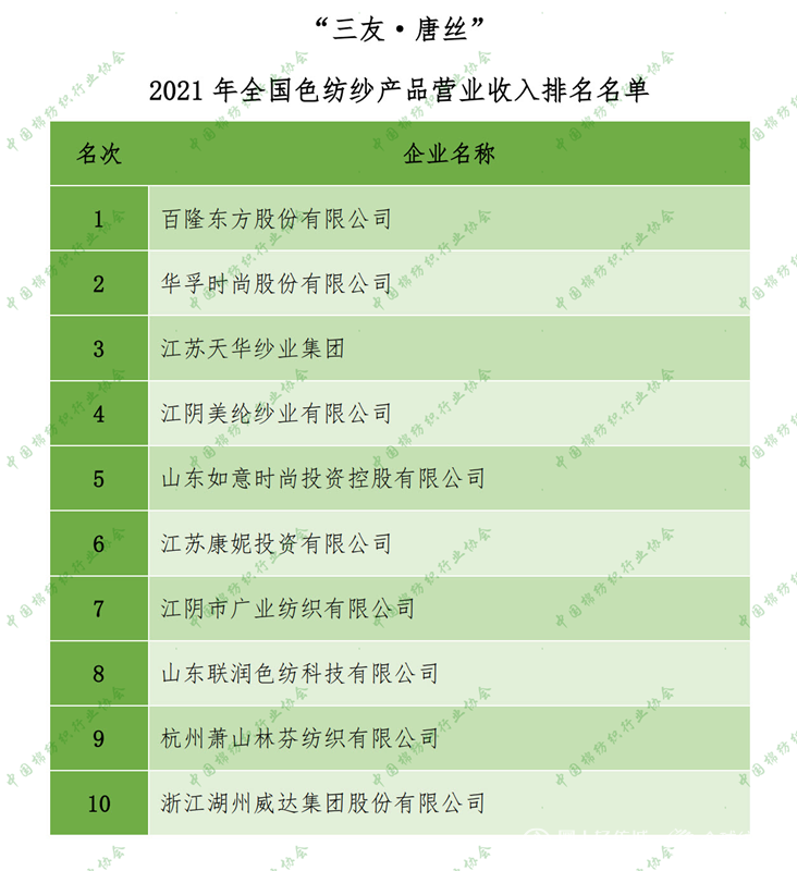 2022年,根据“会员参与、自愿申报、客观排名”的原则,中国棉纺织行业协会继续开展企业营业收入排名工作,并得到了广大会员企业的大力支持与积极响应。中国棉纺织行业协会正式发布“三友·唐丝” 2021年全国棉纺织行业营业收入排名百强名单、“三友·唐丝” 2021年全国棉纺织行业优良发展型企业名单、“三友·唐丝” 2021年全国非棉纱产品营业收入排名名单(含粘胶短纤纱、涤纶短纤纱产品排名名单)、“三友·唐丝” 2021年全国色纺纱产品营业收入排名名单。本工作得到了唐山三友集团兴达化纤有限公司的大力支持!